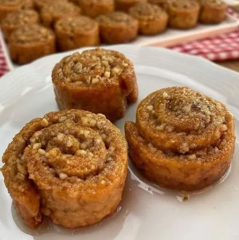 İlk önce şerbeti hazırlayalım şerbet soğuk olacak kaynayınca 10 dakika daha kaynatıp soğumaya bırak Hamuru için ele yapışmayan hamur elde edip İki yağlı kağıt arasında incecik dikdörtgen şeklinde açıp Üzerine her tarafına ceviz gelecek şekilde hamurun üzerine serpin. İki cm aralıklı ince şeritler kesip rulo halinde sarıp tepsiye dizin 170 derece fırında Üzeri kızarana kadar pişirin ilk sıcaklığı çıktıktan sonra şerbeti üzerine dökün.