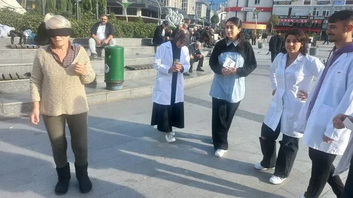 Öğrenciler, gözlerini kapatarak meydanda yürüdüler. Bu sırada, görme engelli bireylerin günlük yaşamda karşı karşıya kaldıkları zorlukları deneyimlediler.