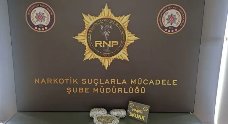 Rize İli genelin de Narkotik Suçlarla Mücade Müdürlüğü Görevlilerinin yapmış olduğu olduğu uyuşturucu ve uyarıcı madde ticareti yapan ve uyarıcı madde getireceği değerlendirilen şahıs ve gruplara yönelik yürütülen operasyon da tespit edilen şahsın üst aramasında;3 parça halinde toplam daralı ağırlığı 462,32 gr. olan SKUNK maddesi ele geçirilmiş olup 2 şahıs hakkında gerekli işlemler yapılmıştır. T.K isimli şahsın yapılan işlemler sonrası çıkarıldığı Adli Makamlarca tutuklanarak cezaevine teslim edilmiştir.