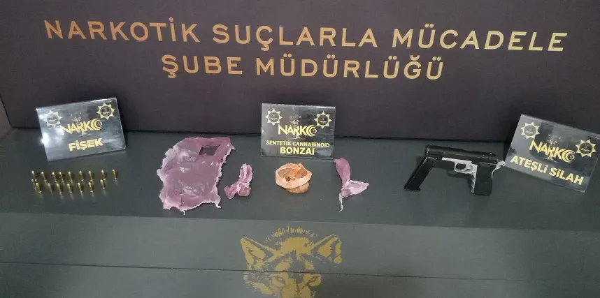 Rize İl Emniyet Müdürlüğü Narkotik Suçlarla Mücadele Şube Müdürlüğü ekiplerince yapılan çalışmalar neticesinde tespit edilen şahısların araç ve üst aramalarında; 34 gram sentetik cannobinoid (bonzai) maddesi ve 1 adet ruhsatsız tabanca ile 17 adet fişek ele geçirildi.